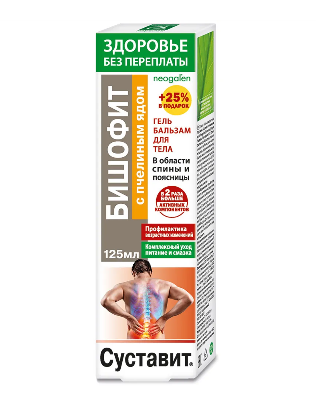 эффективное средство на основе природных компонентов. Способствует нормализации функционального состояния. Обеспечивает структурными элементами для активного обновления и гибкости. Стимулирует естественную регенерацию тканей, препятствует развитию деструктивных процессов и старению. Действие и эффективность геля бальзама обеспечены высокой биологической активностью его натуральных компонентов, обладающих выраженным положительным комплексным действием. Бишофит природный поли минерал, в состав которого входят около70 элементов, в том числе, хлорид магния (главное действующее вещество),а также йод, бром, железо, кремний, цинк. Широко применяется в медицине при заболеваниях суставов, оказывает выраженное противовоспалительное, болеутоляющее и регенерирующее действие, активизирует обменные процессы. Бишофит представляет собой кристаллизованные осадки, образовавшиеся более двухсот миллионов лет назад на глубине1 2,5 км при испарении древних морей. Клинические исследования подтвердили эффективность бишофита при хронических воспалительных и дистрофических заболеваниях опорно двигательного и нервно мышечного аппарата: деформирующих артрозах, ревматоидном артрите, люмбалгии, люмбоишиалгии и других заболеваниях. Пчелиный яд продукт секреторной деятельности ядовитых желез медоносных пчёл, высокоэффективное натуральное средство для лечения заболеваний суставов и позвоночника. Содержит белковые вещества, липиды, биогенные амины, ортофосфорную и нуклеиновую кислоты, комплекс ценных микро и макро элементов. Обладает выраженным противовоспалительным, разогревающим, обезболивающим, бактерицидным, иммуно корректирующим действием, активизирует кровоток, улучшает обмен веществ в суставе и питание суставных тканей. Повышая проницаемость кожных покровов, способствует глубокому проникновению лечебных компонентов в проблемную область. Можжевельник (Juniperus) обладает антисептическим, регенерирующим, болеутоляющим, противовоспалительным, против отёчным действием. Широко применяется в медицине при лечении ревматизма, артрита, остеохондроза, подагры, нарушениях микро циркуляции. Ромашка аптечная (Matricaria chamomilla) традиционное средство при воспалительных заболеваниях и травмах. Оказывает выраженное противовоспалительное, антисептическое, болеутоляющее, противосудорожное действие. Содержит уникальный по богатству комплекс биологически активных веществ. Азулен в составе ромашки обладает противоаллергической, местно анестезирующей активностью, усиливает регенеративные процессы. Апигенин является эффективным спазмолитиком. Ромашка широко применяется в народной медицине при подагре и ревматических воспалениях .Ментол (Mentholum) основной компонент масла мяты перечной. Оказывает местное сосудосуживающее действие, понижая чувствительность нервных окончаний, вызывая ощущения прохлады и облегчая боль. Обладает местным обезболивающим, успокаивающим, выраженным бактерицидным и противовоспалительным действием. Камфора (Camphora) средство растительного происхождения, добывается из листьев и древесины камфорного дерева, произрастающего в Индии и Китае. При наружном применении в области суставов оказывает антисептическое, согревающее, анальгезирующее и противовоспалительное действие, расширяет кровеносные сосуды и у