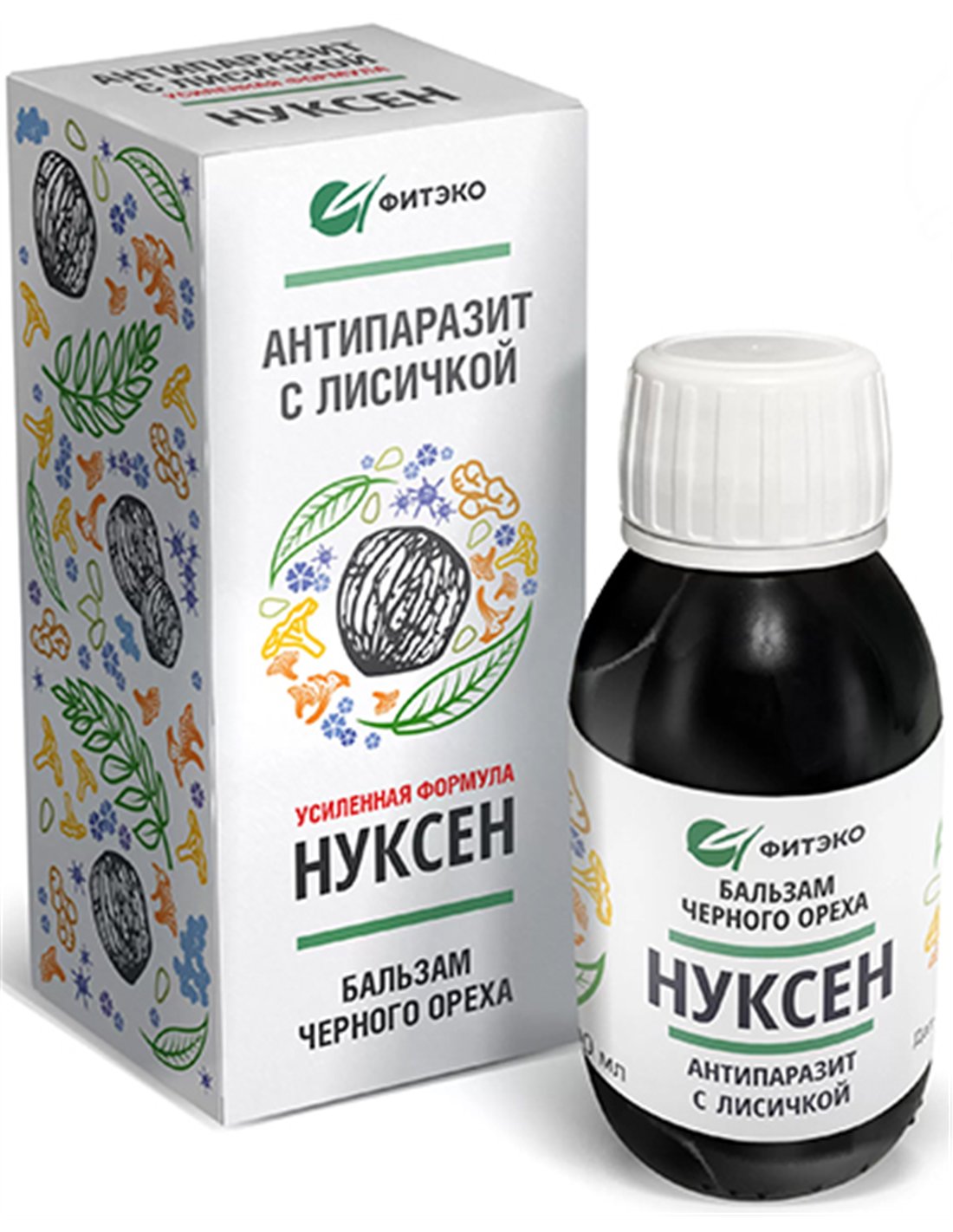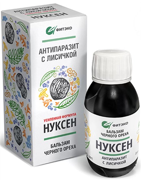 Состав: плоды и лист чёрного ореха, грибы лисички, семена тыквы, соссюрея иволистная, клевер луговой, чабрец, корень девясила, золототысячник, гвоздика, фенхель, имбирь, пижма, вода очищенная, остаточный спирт до 0,5%.