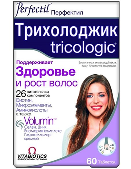 Комплекс витаминов для волос Перфектил «Трихолоджик» способен обеспечивать достаточное питание волосяного покрова, кожи и ногтей. Содержит морской коллаген, цинк, кремний, селен, L- Метионин, L- Цистин, витамины группы В и другие витамины и минералы. Компоненты комплекса способствуют уменьшению выпадения и росту здоровых волос.Особенности:• компоненты комплекса способствуют уменьшению выпадения и росту здоровых волос;• содержит морской коллаген, цинк, кремний, селен, l- метионин, l- цистин, витамины группы в и другие витамины и минералы поддерживают прочность и эластичность волоса; l-цистин укрепляет волосы, сокращает выпадение и предотвращает ломкость; l-метионин способствует выработке коллагена, который отвечает за крепость и упругость волос; инозитол для волос является незаменимым элементом, способствующим укреплению структуры волоса; экстракт виноградных косточек является мощным антиоксидантом.