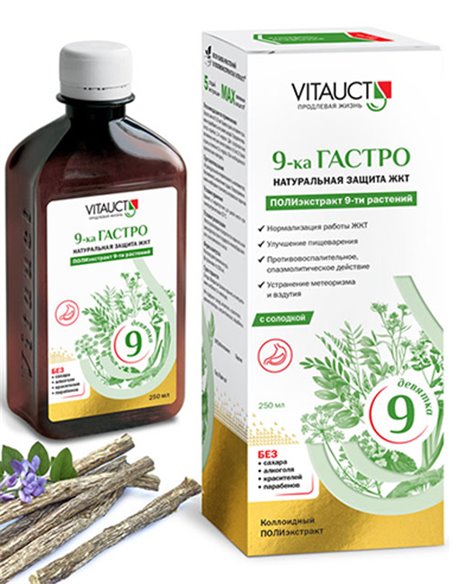 Поскольку 9-ка ГАСТРО не содержит сахара, его могут принимать больные сахарным диабетом. 2 чайные ложки (10 мл) содержат не более 1,0 г сорбита, что соответствует не более 0,1 ХЕ. 1 ХЕ соответствует количеству продуктов питания, в котором содержится 10-12 г углеводов.