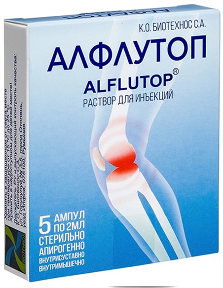 Алфлутоп предотвращает разрушение макромолекулярных структур нормальных тканей, стимулирует процессы восстановления в интерстициальной ткани и ткани суставного хряща, что объясняет его обезболивающее действие.