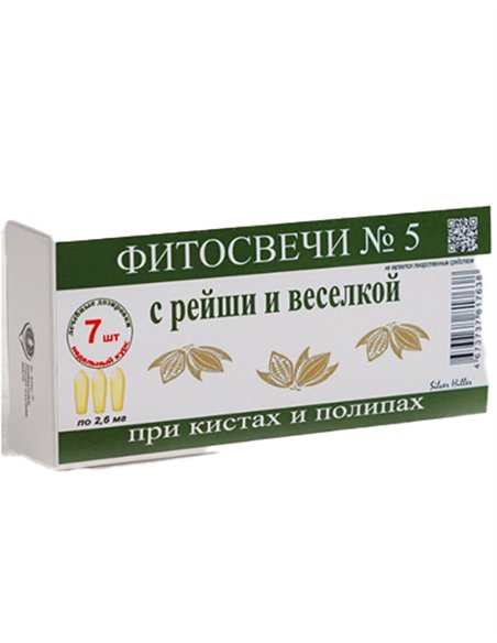 Фитосвечи №5 "С рейши и веселкой" оказывают торможение и уничтожение злокачественных опухолей, проявляют антигистаминное действие, устраняют отеки и раздражения, препятствуют развитию аллергических реакций. Гриб веселка снижает чувствительность организма к возбудителям некоторых заболеваний и считается эффективным при лечении СПИДа, гепатита, цитомегаловируа., Гриб Рейши- восстанавливает гормональный баланс, снижает уровень сахара в крови, действует положительно в динамике лечения аутоиммунных забоеваний.