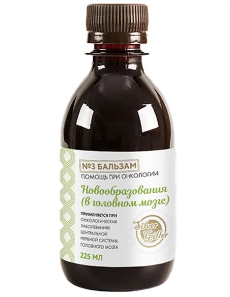 Бальзам №3 «Помощь при онкологии» (рак головного мозга) способствует уменьшению и рассасыванию опухоли, восстановлению сил и иммунитета. Направлен на торможение процесса патологического преобразования клеток мозга или окружающих его оболочечных, железистых и костных тканей, для остановки бесконтрольного деления аномальных клеток, рассасыванию новообразований . Способствует на торможение процессов метастазирования аномальных клеток в другие органы, очищение крови от продуктов распада после химиотерапии, лучевой терапии. Оказывает помощь при восстановлении после хирургического вмешательства. Проявляет противоопухолевое, обезболивающе, антисептическое, противомикробное, рассасывающее и общеукрепляющее действие. Помогает организму быстрее избавиться от продуктов распада и очистить кровь. Может использоваться при- и после химиотерапии.