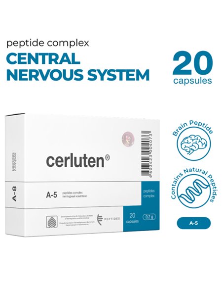 Пептиды мозга (Церлутен), полученные по технологии разработанной Хавинсоном В.Х. из головного мозга молодых и здоровых телят в возрасте от шести месяцев до года. Натуральные пептиды попадая в клетки мозга нормализуют функции всех его отделов и восстанавливают обменные процессы в клетках омолаживая их. Упаковка 60 капсул рассчитана один лечебный курс применения. При хронических заболеваниях рекомендуется повторять курс приема 2 раза в год.