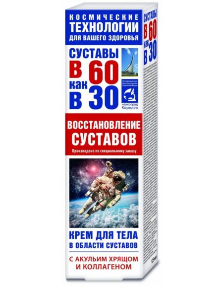 Крем для тела В 60 как в 30 с акульим хрящом и коллагеном- натуральное средство, разработанное совместно Королёвфарм и НПО Космическая реабилитационная медицина специально для предотвращения преждевременных и возрастных дегенеративно -дистрофических процессов в тканях и активного обновления. Содержит все основные структурные компоненты хряща и синовиальной жидкости в биодоступной форме. Улучшает обменные процессы в тканях, стимулирует регенерацию, способствует укреплению связочного аппарата. С помощью нано-структуры, активные компоненты крема без труда проходят сквозь кожный барьер и быстро достигают цели, концентрируясь там и действуя до 24 часов. Активно способствует процессам обновления. Благодаря согревающему эффекту, улучшает микроциркуляцию. Акулий хрящ-превосходный биодоступный источник незаменимого хондроитина. Хондроитин- основной структурный компонент хряща и естественный защитник (хондропротектор) его клеток. Повышает влагоемкость хряща, предотвращает его высыхание. Замедляет резорбцию (разрушение) костной ткани, улучшает форно-кальциевый обмен в хрящевой ткани, стимулирует восстановление изношенных суставных тканей, улучшает качество суставной смазки. Благодаря содержанию кальция, цинка, фосфора, а также различных протеинов в высокой концентрации, ускоряет заживление костных переломов. Глюкозамин (Glucosamine) -неотъемлемый элемент хрящевой ткани. Обеспечивает выработку хондроитина, улучшает обменные процессы в суставах. Стимулирует производство гликозаминогликанов, необходимых для восстановления хрящевой ткани, а также синтез протеогликанов и гиалоурановой кислоты синовиальной жидкости. Тормозит развитие дегенеративных процессов в суставах, снижает болевые ощущения. Коллаген (Collagen) - фибриллярный белок, является основой соединительной ткани организма (сухожилия, хрящ, кость, дерма и т. п.), обеспечивает ее прочность и эластичность. При заболеваниях суставов способствует восстановлению хрящевой ткани и повышению качества синовиальной жидкости, укрепляет связки.