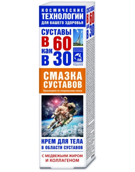 Крем для тела В 60 как в 30 с медвежьим жиром и коллагеном-натуральное средство, разработанное совместно “Королёв-фарм” и НПО ’’Космическая реабилитационная медицина” специально для предотвращения преждевременных и возрастных дегенеративно-дистрофических процессов в тканях и активного обновления. Содержит все основные структурные компоненты хряща и синовиальной жидкости в биодоступной форме. Улучшает обменные процессы в тканях, стимулирует регенерацию, способствует укреплению связочного аппарата. С помощью нано-структуры, активные компоненты крема без труда проходят сквозь кожный барьер и быстро достигают цели, концентрируясь там и действуя до 24 часов. Активно способствует процессам обновления. Благодаря согревающему эффекту, улучшает микроциркуляцию. Медвежий жир - традиционное народное средство для лечения артритов и радикулита. Особые лечебные свойства медвежьего жира обусловлены накоплением в нем биологически активных веществ, необходимых для поддержания жизнедеятельности организма в период зимней спячки -комплекс ценных белков, макро-и микро- элементов. Коллаген (Collagen) - фибриллярный белок, является основой соединительной ткани организма (сухожилия, хрящ, кость, дерма и т. п.), обеспечивает ее прочность и эластичность. При заболеваниях суставов способствует восстановлению хрящевой ткани и повышению качества синовиальной жидкости, укрепляет связки. Хондроитин сульфат (Chondroitinsulfate) - основной структурный компонент хряща и естественный защитник (хондропротектор) его клеток. Повышает влагоемкость хряща, предотвращающего высыхание. Замедляет резорбцию (разрушение) костной ткани, улучшает фосфорно-кальциевый обмен в хрящевой ткани, стимулирует регенерацию суставных тканей, улучшает качество суставной смазки. Глюкозамин (Glucosamine) -неотъемлемый элемент хрящевой ткани. Обеспечивает выработку хондроитина, улучшает обменные процессы в суставах. Стимулирует производство гликозаминогликанов, необходимых для восстановления хрящевой ткани, а также синтез протеогликанов и гиалуроновой кислоты синовиальной жидкости. Тормозит развитие дегенеративных процессов в суставах, снижает болевые ощущения. Метилсульфонилметан(methylsulfonylmethane, МСМ) входит в состав гликозаминогликанов. Участвует в формироваии коллагена, способствующего укреплению хрящевой ткани и мышц, эффективно устраняет болевой синдром при системных воспалительных заболеваниях. Дигидрокверцетин (ДГК) - растительный пигмент (флавоноид),эталонный природный антиоксидант. Обеспечивает профилактику дегенеративно-дистрофических процессов, предупреждает раннее клеточное старение. Стимулирует процессы регенерации суставного хряща, уменьшает отечность, предохраняет от повреждения стенки сосудов, доставляющих суставам питание.