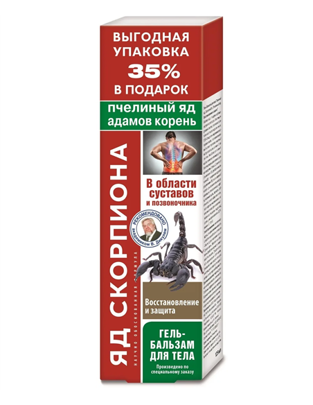 Многочисленные исследования доказали, что яд скорпиона обладает огромным потенциалом. Он обладает выраженным противовоспалительным и обезболивающим эффектом. Гель-бальзам на основе яда скорпиона способствует быстрому восстановлению при ревматизме, артрите, остеохондрозе, радикулите, воспалении седалищного нерва, ноющих болях в суставах, мышечных судорогах, вывихах и растяжениях мышц. Гель-бальзам активизирует механизмы регенерации хрящевой ткани и содействует комплексному оздоровлению опорно-двигательного аппарата.