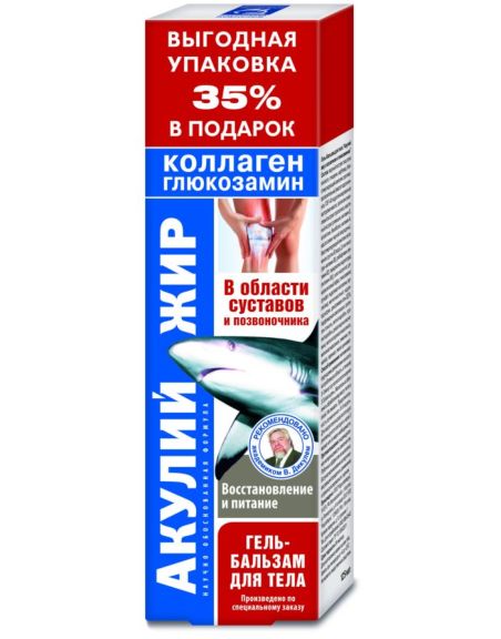 Средства, на основе акульего жира, способствуют укреплению иммунитета, снятию признаков воспаления, выведения накопленных токсинов, поэтому могут использоваться для лечения артритов, снятия мышечных, суставных болей, после радиоактивного воздействия для предотвращения развития осложнений. Гель-бальзам способен нормализовать обменные процессы не только внутри суставов конечностей, но и внутри межпозвоночных дисков. Он также укрепляет мышцы и связки, и способен избавить от солевых отложений. Ускоряет процессы регенерации при повреждениях хрящей и костей, предотвращает разрушение хрящей, ускоряет заживление переломов, снимает болевой синдром, повышает эластичность соединительной ткани. Глюкозамин и коллаген - способствуют регенерации и укреплению хрящей, связок, повышают их прочность и упругость, улучшают подвижность суставов и позвоночника.