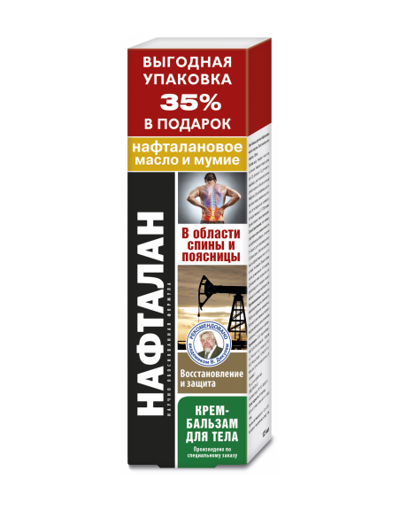 Эффективное средство в области суставов на основе нафталана и других природных компонентов. Крем-бальзам обладает уникальными целебными свойствами, он оказывает многообразное лечебное воздействие на организм человека. Обладает противовоспалительным, обезболивающим, сосудорасширяющим и стимулирующими свойствами. Нафталан используется при невралгических заболеваний: межреберная невралгия, невралгия тройничного, затылочного и седалищного нервов, а также пояснично-крестцовый и шейный плечевой радикулит, заболевания суставов, остеохондроз межпозвонковый. Мумие-один из самых мощных биостимуляторов. Активизирует репаративные процессы, ускоряет восстановление костных и хрящевых тканей, замедляет процессы старения сустава, способствует уменьшению ломоты, возникающей при переменах погоды.